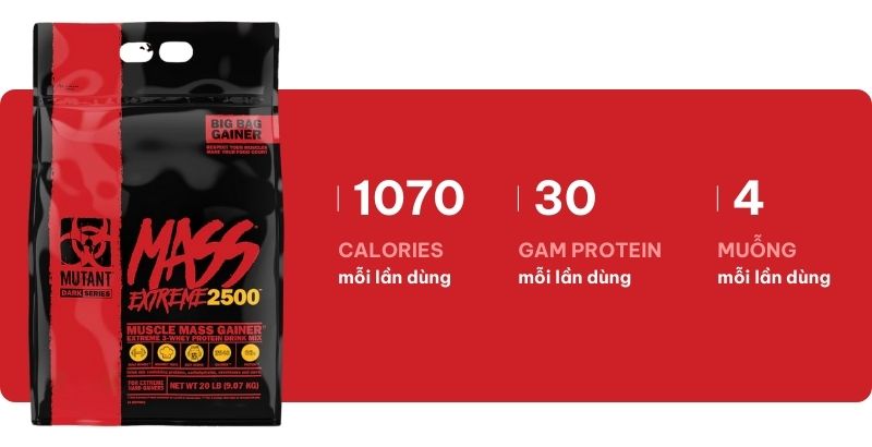 Mutant Mass Extreme 2500 là sản phẩm sữa tăng cân cao cấp dành cho người gầy thường xuyên tập thể thao hay làm các công việc nặng nhọc. Nguồn năng lượng hấp thụ nhanh chủ yếu đến từ hỗn hợp tinh bột như lúa mạch, khoai lang, yến mạch,... và whey protein. Tất cả được tổng hợp chỉ trong 1 muỗng sữa tăng cân giúp bạn nạp nhanh calo cho các hoạt động thể chất. Lượng calo dư thừa được cơ thể tích lũy lại, qua đó giúp tăng cân hiệu quả.